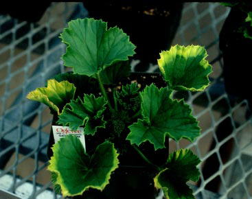 Typical leaf yellowing caused by Cycocel phytotoxicity of poinsettias. Typical leaf yellowing caused by Cycocel phytotoxicity of geraniums.